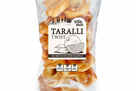 Изделия бараночные “TARALLI TWIST“, Tralli Valli, со вкусом апельсина имеет оригинальную форму и приятные цитрусовые нотки. Отлично подойдёт к чаю или кофе. Особый замес теста. Без обжарки, ГМО и пальмового масла. Масса нетто: 220 г.