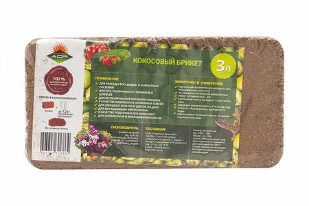 Кокосовый брикет, Торговый дом АСР – это универсальный органический материал. Просто растворите брикет в воде (до 1,25 л) и Вы получите 3 л готового экологичного грунта. Можно использовать для всех видов рассады, овощных культур, комнатных и дачных растений, деревьев и кустарников. Также он пригодится в качестве компонента почвенных смесей или подстилки для животных, для выращивания микрозелени, террариумов, выращивания улиток. Перед использованием ознакомьтесь с инструкцией и мерами предосторожности на упаковке. Размер: 20х10х2,5 см. Объём: 3 л. Вес: 250 г. Состав: 100% кокосовый торф.