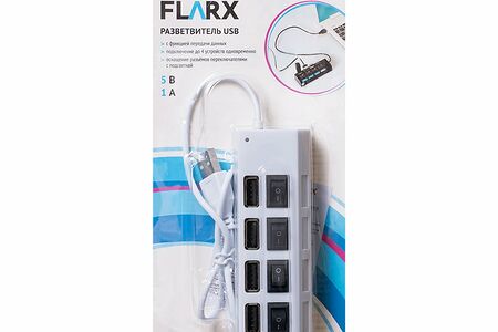 Разветвитель USB, FLARX, позволяет подключить к компьютеру до 4 устройств одновременно. С функцией передачи данных. Каждый разъём оснащён переключателем с подсветкой. Возможно подключение дополнительного источника питания (5 В, 1 А) при помощи блока питания (в комплект не входит). Разветвитель не подходит для подзарядки электронных устройств. Перед применением ознакомьтесь с инструкцией и мерами предосторожности на упаковке. В разветвителе 4 разъёма. Длина провода: 40 см. Состав: АБС, ПВХ, сталь, медь. Товар представлен в ассортименте.