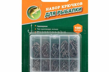 Набор крючков для рыбалки – это отличное решение для тех, кто любит отдыхать на природе с удочкой в руках! В комплект входят одинарные крючки разных размеров: 3, 4, 5, 6, 7, 8, 9, 10, 11, 12. Общее количество: 100 штук. Тип крепления: кольцо. Упаковка представляет собой футляр с отсеками для удобного раздельного хранения. Состав: углеродистая сталь, полипропилен.