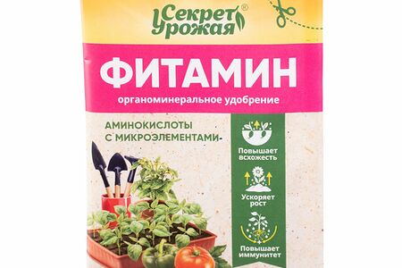 Удобрение органоминеральное "Фитамин", Секрет урожая, снабжает растения аминокислотами и микроэлементами в легкодоступной форме. Даёт растениям энергию для роста и развития. Способствует быстрому наращиванию вегетативной массы и повышению иммунитета растений. Перед использованием ознакомьтесь с инструкцией и мерами предосторожности на упаковке. Масса нетто: 5 г.