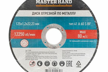 Диск отрезной по металлу, Master Hand, из корунда подойдёт для разрезания изделий из стали. Тип: 41 A 60 S BF. Максимальное число оборотов в минуту: 12 250. Максимальная скорость: 80 м/c. Перед применением ознакомьтесь с информацией на диске. При использовании соблюдайте правила техники безопасности. Размер: 125х1,2х22,23 мм. Бренд: Master Hand