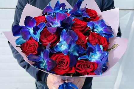 Состав: Орхидея - 17; Роза красная - 10; Упаковка - 2; Лента - 1. Ширина: 25см. Высота: 40см.