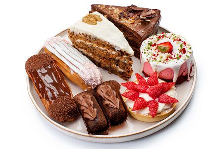 Сведения о составе: Эклер ванильный, эклер шоколадный, тарталетка с клубникой или тропическая, муссовое пирожное, бельгийский шоколад, морковное пирожное, картошка. Возможны замены по умолчанию.Страна изготовления: ООО "ФУД ЛАБ", Россия, Московская областьСведения об упаковке: Пакет