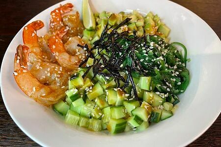 Рис, королевские креветки, авокадо, огурец, салат чука, нори, кунжут, соус манго, соус терияки. Продавец: ИП Вайсман Давид Романович (772795187011) 117638, г. Москва, ул. Сивашская, д. 6, к. 1, кв. 222 319774600210423