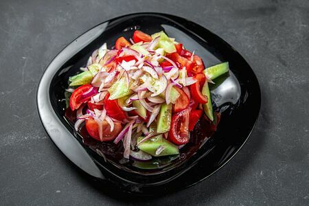 Легкий салат из свежих помидоров, огурцов, красного сладкого перца, красного лука и заправкой из оливкового масла Продавец: ИП Беляев Владимир Валентинович (773500013688) 124527, г. Москва, Зеленоград, корп. 801, кв. 214. 320774600120252