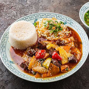 Рис, говядина, кисло-сладкий соус, болгарский перец, морковь, кунжут, репчатый лук, кинза, салат из моркови и капусты Продавец: ИП Ле Тхи Тоан (370208260699) 109386, г. Москва, ул. Краснодарская, д. 48, кв.41 318774600628684