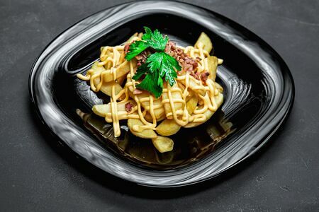 Крупные ломтики (10х20 мм) картофеля фри с сырным соусом и кусочками бекона Продавец: ИП Беляев Владимир Валентинович (773500013688) 124527, г. Москва, Зеленоград, корп. 801, кв. 214. 320774600120252