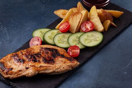 Запеченное куриное филе со специями, свежие овощи, картофель фри, соус Продавец: ИП ВЕНГЕРОВ ВЛАДИМИР ЮРЬЕВИЧ (771003844142) УЛИЦА БОЛЬШАЯ ГРУЗИНСКАЯ, Д. 56, КВ./ОФ. 19, Г. МОСКВА 321774600800977