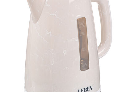 Электрический чайник LEBEN 2200 Вт объемом 1,7 л быстро вскипятит воду для приготовления горячих напитков. Чайник имеет привлекательный дизайн в цвете «белый мрамор», будет красиво смотреться в интерьере современной кухни любого стиля. Поворот корпуса на 360 градусов делает прибор удобным в использовании. После закипания чайник автоматически отключается, а также предусмотрена функция отключения при отсутствии воды, что предохраняет его от перегрева и поломки. Световой индикатор нагрева сообщит о том, что электроприбор включен.