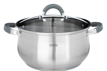 Серия посуды «Вена» — это элегантные кастрюли со стеклянными крышками, ручки имеют силиконовые вставки, которые не нагреваются. Капсульное дно равномерно распределяет тепло и предотвращает пригорание пищи. Посуда из нержавеющей стали не окисляется, материал не впитывает и не выделяет запахи, что положительно влияет на вкус пищи. Идеально подходит для готовки и длительного хранения в холодильнике. Посуда из нержавеющей стали имеет высокую прочность и экологически безопасна. Кастрюли Vetta — это новое поколение кухонной утвари, с которой готовка проходит быстрее и качественнее. Вы не только экономите свое время, но и газ или электричество. 7 причин купить кастрюлю нержавеющей стали торговой марки Vetta: • капсульное дно ускоряет процесс приготовления • стеклянная крышка с отводом для пара • подходит для всех типов плит • можно мыть в посудомоечной машине • можно хранить пищу в холодильной камере • мерная шкала на внутренней стенке. *объем кастрюли указан при наливании жидкости до краёв.