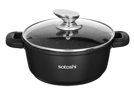 Кастрюля с антипригарным покрытием Satoshi Lion готовит на плите и в духовом шкафу. Силиконовые ручки выдерживают высокие температуры, не плавятся. Крышка из жаропрочного стекла оснащена металлическим ободком. Отверстие для пара исключает проливание кипящей жидкости на варочную поверхность.