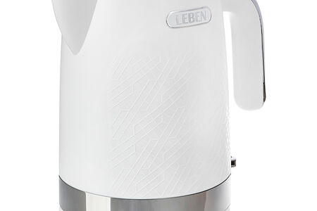 Электрический чайник LEBEN 2200 Вт объемом 1,7 л имеет современный дизайн в белом цвете, который впишется в любой интерьерный стиль кухни. Обладает всеми необходимыми функциями: автоотключение после закипания и при отсутствии воды, световая индикация работы. Поворот корпуса 360 градусов позволяет ставить чайник на платформу с любой стороны. Прибор имеет удобное расположение кнопки включения, а также комфортную ручку, которая не скользит в руке. Работает от электрической сети 220-240 В.