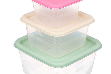 Набор квадратных контейнеров общего назначения. В них удобно брать еду и продукты на пикники, на работу, хранить в холодильнике. Контейнеры из пищевого пластика. В наборе 3 контейнера. Объем 630, 330 и 150 грамм.