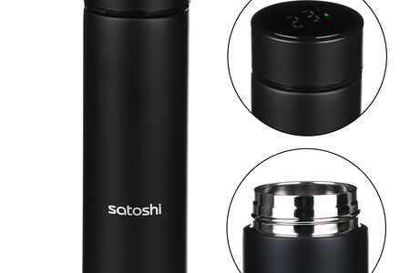 Умный термос-кружка SATOSHI из нержавеющей стали с датчиком температуры – это современный аксессуар для тех, кому важно, чтобы все было под контролем. Теперь вы в любой момент сможете узнать температуру напитка внутри емкости – достаточно просто провести пальцем по верхней части крышки. Строгий черный корпус с нескользящей поверхностью создан специально для любителей стильных вещей.