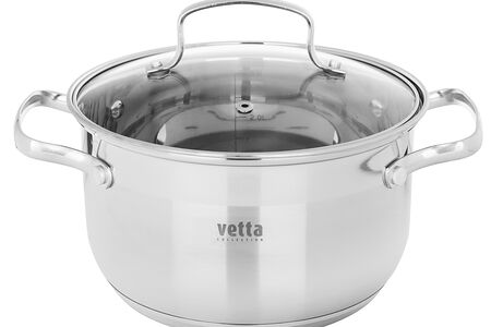 Серия посуды «Берн» — это элегантные кастрюли со стеклянными крышками. Капсульное дно равномерно распределяет тепло и предотвращает пригорание пищи. Посуда из нержавеющей стали не окисляется, материал не впитывает и не выделяет запахи, что положительно влияет на вкус пищи. Идеально подходит для готовки и длительного хранения в холодильнике. Посуда из нержавеющей стали имеет высокую прочность и экологически безопасна. Кастрюли Vetta — это новое поколение кухонной утвари, с которой готовка проходит быстрее и качественнее. Вы не только экономите свое время, но и газ или электричество. 7 причин купить кастрюлю нержавеющей стали торговой марки Vetta: • капсульное дно ускоряет процесс приготовления • стеклянная крышка с отводом для пара • подходит для всех типов плит • можно мыть в посудомоечной машине • можно хранить пищу в холодильной камере • мерная шкала на внутренней стенке. *объем кастрюли указан при наливании жидкости до краёв.