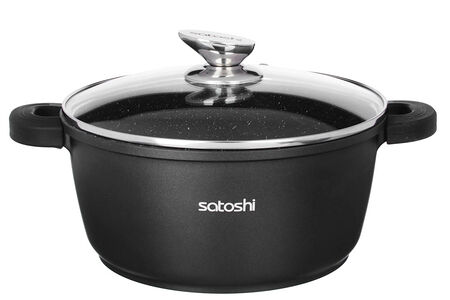 Кастрюля с антипригарным покрытием Satoshi Lion готовит на плите и в духовом шкафу. Силиконовые ручки выдерживают высокие температуры, не плавятся. Крышка из жаропрочного стекла оснащена металлическим ободком. Отверстие для пара исключает проливание кипящей жидкости на варочную поверхность.