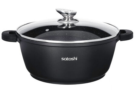 Кастрюля с антипригарным покрытием Satoshi Lion готовит на плите и в духовом шкафу. Силиконовые ручки выдерживают высокие температуры, не плавятся. Крышка из жаропрочного стекла оснащена металлическим ободком. Отверстие для пара исключает проливание кипящей жидкости на варочную поверхность.