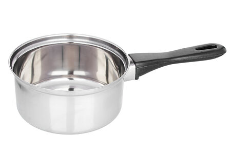 Ковш диаметром 14 см из нержавеющей стали с черной бакелитовой ручкой.