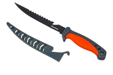 Нож разделочный филейный ЕРМАК 27,3 см из нержавеющей стали с длиной лезвия 15 см может использоваться как дома, так и в туристических походах, а также на охоте и рыбалке. Удобен для разделки рыбы, а также нарезки овощей и хлеба. Серрейторная заточка долго сохраняет остроту. Лезвие имеет покрытие, которое защищает клинок от царапин и не позволяет продуктам прилипать к ножу. Прорезиненная антискользящая рукоять удобно ложится в руку, а отверстия на рукояти можно использовать для темляка. В комплекте имеется пластиковый чехол для хранения и транспортировки.