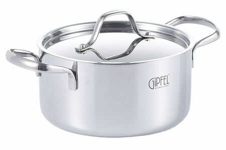 Кастрюля из нержавеющей стали Gipfel Galaxy 51968. Объем данной модели 2,2 л, диаметр 18 см, высота стенок 9,5 см.Толщина – 2,3 мм (нержавеющая сталь 18/10 (0,5 мм) + алюминий (1,3 мм) + нержавеющая сталь 18/0 (0,5 мм)). Между слоями нержавеющей стали, которая с одной стороны соприкасается с поверхностью плиты, а с другой стороны контактирует с едой, заключен слой алюминия. Алюминий запаян внутрь стальной оболочки.Кастрюля изготовлена из нержавеющей стали «18/10», что гарантирует ее прочность и долговечность, а также гигиеничность посуды — отсутствие пор в данном материале исключает концентрацию вредных веществ. Эта кастрюля отлично подойдет для хранения еды после приготовления - вкус и полезные свойства пищи нисколько не пострадают.У Кастрюли индукционное капсульное дно: при приготовлении пища нагревается равномерно и не подгорает, стенки кастрюли не ломаются и не деформируются при использовании на различных видах плит.Дизайн посуды разработан с учетом максимума удобства при применении: глянцевая поверхность, плавные линии и ручки с удобным захватом. Цельная стальная ручка является наиболее надёжной и долговечной. Она полая внутри, благодаря чему она не нагревается. Ручка крепится к корпусу методом точечной сварки.Внутри кастрюли нанесена мерная шкала, с помощью которой удобно отмерить нужное количество воды и следить за ее уровнем.Данная модель со стальной крышкой толщиной 0,7 мм, без отверстий для пара, с клёпочным креплением ручки. Она легко впишется в современный кухонный дизайн. Кастрюля упакована в коробку.Рекомендации по использованию и уходу:Не перегревать пустую или почти пустую кастрюлю.Не мыть жесткой металлической губкой.Можно мыть в посудомоечной машине.Вытирать после мытья.Можно использовать на всех типах плит.