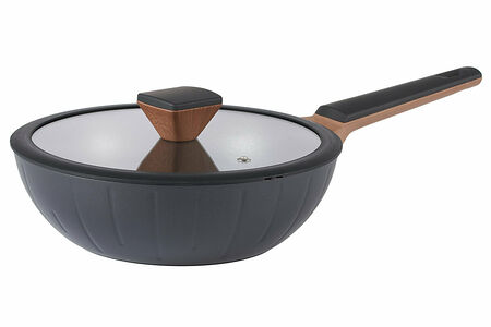 Сковорода-вок Werner Vertical 51916 24x7,5 см. Изготовлена из кованого алюминия, из которого получаются прочные и легкие сковороды с тонкими стенками и толстым дном. Двухслойное антипригарное покрытие Pfluon облегчает приготовление любых продуктов (овощей, ризотто, плова), легко выдерживает интенсивную эксплуатацию, однако требует бережного обращения. Металлические ложки и лопатки поцарапают поверхность, поэтому для помешивания рекомендуем использовать деревянные или силиконовые лопатки. Вок выполнен в лаконичном дизайне: основание черного цвета, стеклянная крышка с силиконовым ободом и бакелитовой ручкой в коричневом цвете с отделкой под дерево и покрытием Soft Touch (удобно держать и не скользит в руке). Толщина дна: 3,3 мм, толщина стенок: 2,8 мм. Сковорода идеально подходит для приготовления плова и лагмана, ее быстро и удобно мыть. Упакована в фирменную коробку. Рекомендации по использованию и уходу:Не использовать металлические лопатки.Не мыть жесткой металлической губкой и чистящими порошками.Не разрезать приготовленную пищу в посуде.Не подвергать термошоку.Не рекомендуется мыть в посудомоечной машине.Не жарить еду без масла.Можно использовать на всех типах плит.