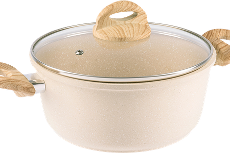 52204 Кастрюля Werner Letizia 22,0х9,5 см/3,3 л со стеклянной крышкой из литого алюминия с антипригарным мраморным покрытием GMM DURASLATE и оснащена ручкой бакелит «под дерево» с покрытием soft-touch. Стеклянная крышка в комплекте. Оригинальная светлая расцветка. Толщина дна/стенок: 5,0/2,5 мм.