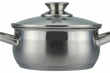 Кастрюля Gipfel 1743 — самая миниатюрная модель из серии Serenade, объемом 2,1 литра. Модель выполнена из нержавеющей стали в оригинальном дизайне, который украсит любую кухню. Термоаккумулирующее дно кастрюли обеспечит быстрый и равномерный нагрев при приготовлении. Данная модель подходит для всех типов плит, включая индукционную, допускается ее мытье в посудомоечной машине. Толщина стенок 0,6 мм, толщина дна 3 мм.