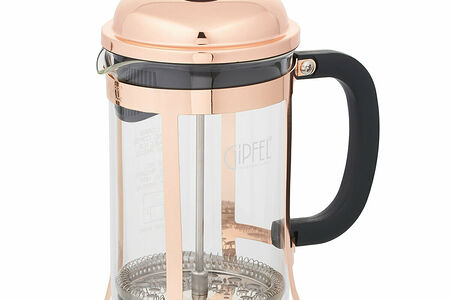 Френч-пресс Gipfel Claris 7094 из боросиликатного стекла. Объем колбы из жаропрочного стекла составляет 0,8 л. Подставка и крышка с покрытием «розовое золото», а кнопка и ручка — из черного пластика. Конструкция модели продумана до мелочей, поэтому использовать такую посуду можно без риска получить ожог. Благодаря системе френч-пресс приготовить ароматный чай и восхитительный кофе не составит труда. Использованная заварка или гуща легко вынимаются. Рекомендуется мыть вручную.