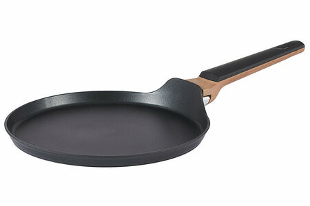 Сковорода блинная Werner Vertical 51917 24x1,7 см. Изготовлена из кованого алюминия, из которого получаются прочные и легкие сковороды с тонкими стенками и толстым дном. Двухслойное антипригарное покрытие Pfluon облегчает приготовление любых продуктов, легко выдерживает интенсивную эксплуатацию, однако требует бережного обращения. Металлические ложки и лопатки поцарапают поверхность, поэтому для помешивания рекомендуем использовать деревянные или силиконовые лопатки. Сковорода выполнена в лаконичном дизайне: основание черного цвета и бакелитовой ручкой в коричневом цвете с отделкой под дерево и покрытием Soft Touch (удобно держать и не скользит в руке). Толщина дна: 3,3 мм, толщина стенок: 2,8 мм. Сковорода диаметром 24 см идеально подходит для выпекания ровных и тонких блинчиков, ее быстро и удобно мыть.Рекомендации по использованию и уходу:Не использовать металлические лопатки.Не мыть жесткой металлической губкой и чистящими порошками.Не разрезать приготовленную пищу в посуде.Не подвергать термошоку.Не рекомендуется мыть в посудомоечной машине.Не жарить еду без масла.Можно использовать на всех типах плит