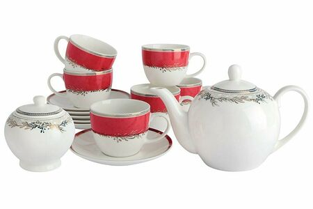 Сервиз чайный Gipfel Charlotte 51563 14 предметов на 6 персон: чайник заварочный 900 мл, сахарница 250 мл, чашка 200 мл (6 шт.) и блюдце 15 см (6 шт.). Чайный сервиз Gipfel Charlotte из костяного фарфора – элегантный и практичный, добавит шарм и изысканность вашему столу. Изготовлен из высококачественного фарфора, он станет великолепным предметом сервировки, и позволит Вам насладиться не только вкусом и ароматом напитков, но и красотой посуды, которая сервируется на стол. Костяной фарфор, из которого изготовлена вся посуда коллекции Gipfel Charlotte, отличается от обычного фарфора повышенной прочностью и белизной. Фарфоровая посуда – это, прежде всего, эстетическое наслаждение. Ее гладкая поверхность и стильный дизайн создают великолепное визуальное впечатление. Каждая деталь фарфорового сервиза Gipfel Charlotte тщательно продумана, чтобы подчеркнуть изысканность сервировки. Благодаря контрастному сочетанию белого и красного цветов, очаровательному золотистому кружевному и растительному узорам, посуда смотрится необыкновенно нарядно и создает особую праздничную атмосферу. Такая посуда украсит Новогодний стол и любой другой праздник. В чашке из костяного фарфора чай получится более насыщенным и ароматным, с ощутимыми нотками терпкости, так как данный материал содержит много кальция в составе. К тому же, фарфор дольше остальных материалов сохраняет тепло, а значит вкус и качество напитка будет неизменным на протяжении всей чайной церемонии. Погрузитесь в мир изысканности и утонченности с фарфоровой посудой Gipfel Charlotte и создайте неповторимую атмосферу на Вашем столе. Чайный сервиз Gipfel Charlotte 51563 упакован в фирменную коробку. РЕКОМЕНДАЦИИ ПО ИСПОЛЬЗОВАНИЮ И УХОДУ:Беречь от ударов и падений.Не подвергать перепадам температуры.Не нагревать в микроволновой печи, на конфорках плиты или открытом пламени. Не использовать абразивные средства или металлические мочалки. Не мыть в посудомоечной машине. Для мытья использовать жидкие моющие средства и мягкую губку.