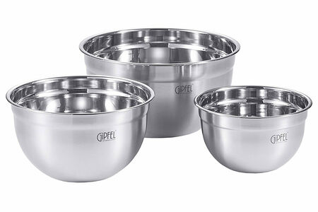 Набор мисок Gipfel Horizonte 51159 из трёх штук:диаметром 16 см и высотой 10 см, вместимостью 1,5 л с мерной шкалой до 1 л;диаметром 20 см и высотой 12 см, вместимостью 2,7 л с мерной шкалой до 1,5 л;диаметром 24 см и высотой 13 см, вместимостью 4,2 л с мерной шкалой до 3 л.Миски выполнены из нержавеющей стали 18/0. Это универсальная нержавеющая сталь с высокой устойчивостью к коррозии. Толщина стенок 0,6 мм.Торцы стенок оснащены миниатюрными бортиками, чтобы было удобно брать даже влажными или жирными руками и переносить без опасения, что миска выскользнет из рук.Незаменимая в хозяйстве металлическая посуда в стильном дизайне: снаружи имеет матовую поверхность, внутри – зеркальную. Помимо того, что это очень красиво, такие кухонные емкости являются универсальными для работы с различными продуктами, а также для их хранения в холодильнике. Миски Gipfel Horizonte безопасны для здоровья и гигиеничны, не окрашиваются и не впитывают запахи.Упакованы в фирменную коробку.Рекомендации по использованию и уходу:Использование с кухонными инструментами и аксессуарами из любых материалов, в том числе с металлическими.Можно мыть в посудомоечной машине.Не следует мыть жесткой металлической губкой.Требуется вытирать после мытья.