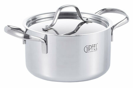 Кастрюля из нержавеющей стали Gipfel Galaxy 51967. Объем данной модели 1,9 л, диаметр 16 см, высота стенок 9,5 см. Толщина – 2,3 мм (нержавеющая сталь 18/10 (0,5 мм) + алюминий (1,3 мм) + нержавеющая сталь 18/0 (0,5 мм)). Между слоями нержавеющей стали, которая с одной стороны соприкасается с поверхностью плиты, а с другой стороны контактирует с едой, заключен слой алюминия. Алюминий запаян внутрь стальной оболочки.Кастрюля изготовлена из нержавеющей стали «18/10», что гарантирует ее прочность и долговечность, а также гигиеничность посуды — отсутствие пор в данном материале исключает концентрацию вредных веществ. Эта кастрюля отлично подойдет для хранения еды после приготовления - вкус и полезные свойства пищи нисколько не пострадают.У Кастрюли индукционное капсульное дно: при приготовлении пища нагревается равномерно и не подгорает, стенки кастрюли не ломаются и не деформируются при использовании на различных видах плит.Дизайн посуды разработан с учетом максимума удобства при применении: глянцевая поверхность, плавные линии и ручки с удобным захватом. Цельная стальная ручка является наиболее надёжной и долговечной. Она полая внутри, благодаря чему она не нагревается. Ручка крепится к корпусу методом точечной сварки.Внутри кастрюли нанесена мерная шкала, с помощью которой удобно отмерить нужное количество воды и следить за ее уровнем.Данная модель со стальной крышкой толщиной 0,7 мм без отверстий для пара, с клёпочным креплением ручки. Она легко впишется в современный кухонный дизайн. Кастрюля упакована в коробку.Рекомендации по использованию и уходу:Не перегревать пустую или почти пустую кастрюлю.Не мыть жесткой металлической губкой.Можно мыть в посудомоечной машине.Вытирать после мытья.Можно использовать на всех типах плит.