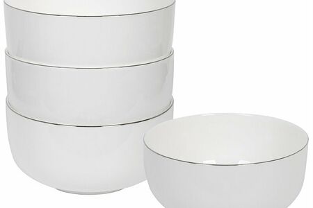 Набор салатников GIPFEL PLATINUM 51537. В наборе 4 салатника диаметром 15 см. Высота 8 см. Вес 368 гр. Салатники изготовлены из костяного фарфора с ободком серебристого цвета по краю. При сервировке сочетаются с другой посудой коллекции PLATINUM. Размер упаковки 24х15,5х15 см; вес упаковки 1500 гр.