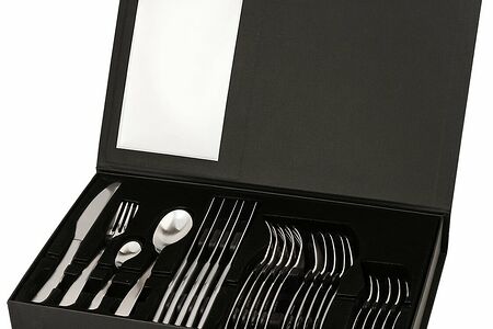 Набор столовых приборов GIPFEL RIOMA 51238. В наборе 24 предмета на 6 персон. В состав набора входят 6 столовых ложек, 6 чайных ложек, 6 вилок и 6 столовых ножей. Предметы изготовлены из нержавеющей стали 18/10 и имеют матовую полировку. Упакованы в подарочную черную коробку. Размер 41,5х5х26 см. Вес 2090 гр.