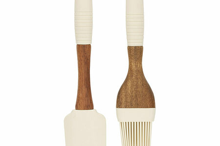 Набор кухонных аксессуаров Gipfel Reno 52182 состоит из двух предметов: лопатка 25 см и кисточка 22 см. Изготовлены из натурального дерева акации и высококачественного пищевого силикона. Эти материалы характеризуются повышенной стойкостью к воздействию используемых при приготовлении жиров, и не влияют на вкусовые качества конечного продукта. У силиконового основания гибкая структура, это идеально подходит для скользящего перемешивания и помешивания в горячей посуде, а также для кастрюль и сковород с антипригарным покрытием и деликатными поверхностями. Лопаткой удобно покрывать готовые изделия глазурью, выравнивать коржи перед выпеканием, перемешивать крем или тесто и многое другое. Кисточка незаменима для обмазывания пищевых продуктов и кулинарной посуды: выпечки яйцом, кремом, соусом, а также смазывания противней, форм и сковород маслом. Предметы имеют уникальный внешний вид благодаря текстуре натуральной акации. Они прекрасно впишутся в интерьер любой кухни и будут радовать своей функциональностью долгое время. Набор кухонных аксессуаров станет приятным подарком. Рекомендуем мыть вручную с использованием мягких чистящих средств, не тереть металлическими губками, не использовать абразивных чистящих средств, не мыть в посудомоечной машине. Набор в фирменной упаковке.