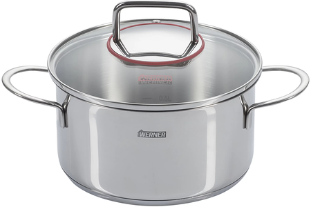 Коллекция из высококлассной нержавеющей стали 18/0 Werner Como отличается современным минималистичным строгим дизайном вкупе с мягкими сглаженными формами. С внешней стороны посуда имеет прекрасно отполированную зеркальную поверхность.Кастрюля с крышкой объемом 2,4 л: диаметр 18 см; высота 9,5 см.Кастрюля имеет многослойное капсульное дно, что способствует равномерному распределению тепла и сохранению температуры блюда уже после процесса готовки, что позволяет ему настояться и приобрести более насыщенный вкус.Ручки прочно приварены. Внутри кастрюли для удобства имеется мерная шкала.Закругленные ручки широко расставлены, поэтому не нагреваются при готовке. Кроме того, можно захватить их всей ладонью, не боясь обжечься о горячие стенки кастрюли. Под ручкой стеклянной крышки имеется диск из нержавеющей стали, нагревающийся гораздо меньше стекла и предотвращающий соприкосновение руки с поверхностью крышки. Диск имеет красную силиконовую герметичную окантовку в цвет фирменного логотипа Werner. На крышке есть отверстие для выхода пара.Посуда из нержавеющей стали долговечна и пригодна для мытья в ПММ.В кастрюле имеется индукционное дно, что позволяет использовать ее на всех видах плит.