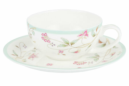 Чайная пара Gipfel Verde 40728: чашка 250 мл и блюдце 17 см. Чайная пара Gipfel Verde из костяного фарфора – элегантная и практичная, добавит шарм и изысканность вашему столу. Изготовленная из высококачественного фарфора, она станет великолепным предметом сервировки, и позволит Вам насладиться не только вкусом и ароматом напитков, но и красотой посуды, которая сервируется на стол. Костяной фарфор, из которого изготовлена вся посуда коллекции Gipfel Verde, отличается от обычного фарфора повышенной прочностью и белизной. Фарфоровая посуда – это, прежде всего, эстетическое наслаждение. Ее гладкая поверхность и стильный дизайн создают великолепное визуальное впечатление. Каждая деталь фарфоровой чайной пары Gipfel Verde тщательно продумана, чтобы подчеркнуть изысканность сервировки. Чайная пара Gipfel Verde декорирована нежным цветочным орнаментом с фуксиями, символом любви и доверия. В чашке из костяного фарфора чай получится более насыщенным и ароматным, с ощутимыми нотками терпкости, так как данный материал содержит много кальция в составе. К тому же, фарфор дольше остальных материалов сохраняет тепло, а значит вкус и качество напитка будет неизменным на протяжении всей чайной церемонии. Погрузитесь в мир изысканности и утонченности с фарфоровой посудой Gipfel Verde и создайте неповторимую атмосферу на Вашем столе. При сервировке сочетается с другой посудой Gipfel Verde. Чайная пара Gipfel Verde 40728 упакована в фирменную коробку. РЕКОМЕНДАЦИИ ПО ИСПОЛЬЗОВАНИЮ И УХОДУ: - Беречь от ударов и падений. - Не подвергать перепадам температуры. - Не нагревать в микроволновой печи, на конфорках плиты или открытом пламени. - Не использовать абразивные средства или металлические мочалки. - Не мыть в посудомоечной машине. - Для мытья использовать жидкие моющие средства и мягкую губку.