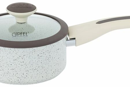 Ковш алюминиевый Gipfel Sonrizo 0431 объемом 1,3 л и диаметром 16 см. Высота с крышкой 13 см, длина с ручкой 32,5 см. Толщина дна – 4 мм, а стенок – 2 мм.Ковш изготовлен из кованного алюминия, что делает его легким и при этом достаточно прочным.Антипригарное керамическое покрытие Excilon абсолютно безвредное для здоровья, при нагревании не выделяет вредных веществ. В составе не содержит PTFE (политетрафторэтилен) и PFOA (перфтороктановой кислоты). Качество изделия подтверждено международными сертификатами.Ковш выполнен в деликатном дизайне, имеет нежную бежевую расцветку и декорирован под мрамор. Наружный декор, имитирующий мраморные вкрапления, повторяет свой рисунок и на керамическом антипригарном покрытии внутри посуды, поддерживая гармоничное целостное восприятие. При этом керамическое покрытие не приобретает свойства мраморного.Эргономичная ручка из бакелита также в светлых тонах с коричневой вставкой и покрытием Soft Touch (не скользит и удобно лежит в руке).Стеклянная крышка с силиконовым ободом коричневого цвета, что делает ее практически бесшумной при открывании и закрывании.Ковш объемом 1,3 л идеален для приготовления каш, соусов и подлив.Ковш в фирменной упаковке.Рекомендации по использованию и уходу:Не использовать металлические лопатки.Не мыть жесткой металлической губкой и чистящими порошками.Не разрезать приготовленную пищу в посуде.Не подвергать термошоку.Не жарить еду без масла.Можно использовать на всех типах плит.