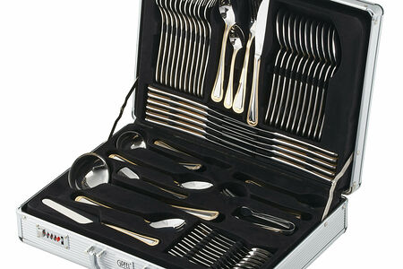 Набор столовых приборов Gipfel Valencia 51406. В состав набора входят 72 предмета: 12 ножей столовых, 12 вилок столовых,12 ложек столовых, 12 ложек чайных, 12 вилок десертных, 2 мясные вилки, 2 ложки салатные, 2 ложки сервировочные, вилка салатная, ложка для сахара, щипцы для сахара, лопатка для торта, половник, соусник. Набор столовых приборов Gipfel Valencia – сочетание роскоши и элегантности. Изготовлен из нержавеющей стали 18/10, безопасного для здоровья металла, прочного и долговечного. Блестящая поверхность изделий великолепно дополнит повседневную и праздничную сервировку, торжественный обед или ужин. Рукоятка имеет рельефный декор с золотистой окантовкой по краю, который не только украшает изделия, они удобно располагаются в руке. Столовые приборы рекомендуется мыть без абразивных средств, желательно в ручном режиме, так они дольше сохранят свой блеск. Набор в подарочной упаковке - алюминиевый кейс серебряного цвета с кодовым замком. Кейс это не только упаковка, но и удобный способ хранения, у каждого прибора своя ячейка. Станет роскошным подарком.