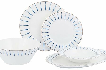 Gipfel Сервиз столовый AZZURRO 21 предмета на 6 персон: тарелка обеденная 26,5см, 6шт, тарелка закусочная 21,5см, 6шт., тарелка суповая 21см, 6шт., овальное блюдо 35,5см, 2шт., салатник, 23см, 1шт. Материал: костяной фарфор.