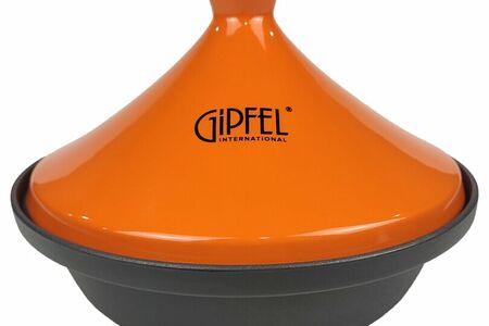 Таджин GIPFEL AMEY . Таджин сделан из чугуна, покрытого эмалью. Крышка оранжевого цвета выполнена из высокотемпературной керамики. Диаметр 29 см. Вес таджина 4,4 кг. Объем таджина 2,4 л. Внутри черное эмалированное покрытие. Упакован в фирменную коробку.
