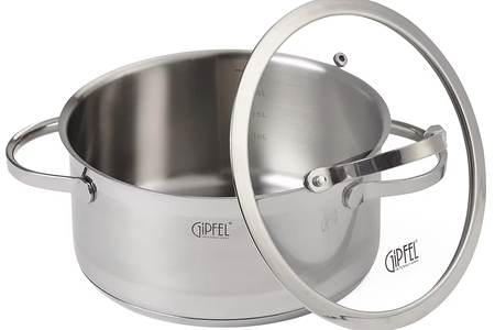 Кастрюля Gipfel 1368 выполнена в классическом дизайне, который впишется в кухню любого стиля, оборудована стеклянной крышкой и ручками, не нагревающимися при готовке. Материал кастрюли — нержавеющая сталь 18/10, дно модели обладает высокими термоаккумулирующими свойствами. Эту посуду можно мыть в посудомоечной машине, а для приготовления подойдут любые источники тепла, в том числе, индукционные. Диаметр кастрюли 20 см. Диаметр дна 18,5 см. Толщина стенок 0,6мм. Толщина дна 3,5 мм: 0,5мм сталь sus 430 + 3 мм алюминий. Кастрюля имеет шкалу до 2,5 литров с шагом 0,5 л. Общий объем кастрюли - 3 л, рабочий объем - 2,5 л.