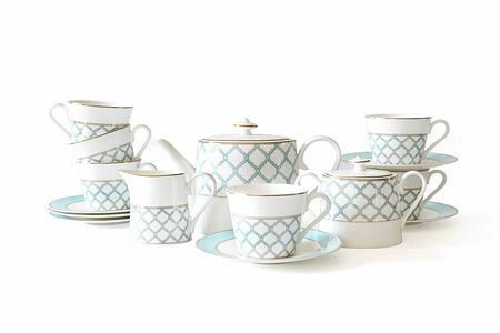 Чайный сервиз Gipfel Aurora 42863. 15 предметов на 6 персон: чайник заварочный 1250 мл, сахарница 390 мл, соусник 200 мл, чашка 250 мл (6 шт.) и блюдце 16 см (6 шт.). Чайный сервиз Gipfel Aurora из костяного фарфора – элегантный и практичный, добавит шарм и изысканность вашему столу. Изготовлен из высококачественного фарфора, он станет великолепным предметом сервировки, и позволит Вам насладиться не только вкусом и ароматом напитков, но и красотой посуды, которая сервируется на стол. Костяной фарфор, из которого изготовлена вся посуда коллекции Gipfel Aurora, отличается от обычного фарфора повышенной прочностью и белизной. Фарфоровая посуда – это, прежде всего, эстетическое наслаждение. Ее гладкая поверхность и стильный дизайн создают великолепное визуальное впечатление. Каждая деталь фарфорового сервиза Gipfel Aurora тщательно продумана, чтобы подчеркнуть изысканность сервировки. Сервиз Gipfel Aurora выполнен в современном стиле с налетом винтажности: воздушно-бирюзовая кайма с кружевным орнаментом в золоте. В чашке из костяного фарфора чай получится более насыщенным и ароматным, с ощутимыми нотками терпкости, так как данный материал содержит много кальция в составе. К тому же, фарфор дольше остальных материалов сохраняет тепло, а значит вкус и качество напитка будет неизменным на протяжении всей чайной церемонии. Погрузитесь в мир изысканности и утонченности с фарфоровой посудой Gipfel Aurora и создайте неповторимую атмосферу на Вашем столе. Чайный сервиз Gipfel Aurora 42863 упакован в фирменную коробку.РЕКОМЕНДАЦИИ ПО ИСПОЛЬЗОВАНИЮ И УХОДУ:Беречь от ударов и падений.Не подвергать перепадам температуры.Не нагревать в микроволновой печи, на конфорках плиты или открытом пламени.Не использовать абразивные средства или металлические мочалки.Не мыть в посудомоечной машине.Для мытья использовать жидкие моющие средства и мягкую губку.