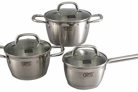 Состав набора:- ковш с крышкой 16 х 9 см - 1,8 л (диаметр 13 см)- кастрюля с крышкой 18 х 10 см - 2,5 л (диаметр 15 см)- кастрюля с крышкой 20 х 11 см - 3,4 л (диаметр 17 см)Описание:- толщина дна 5 мм- толщина стенок 0,8 мм- нержавеющая сталь марки 18/10- матовая сталь с полированной окантовкой- многослойное теплоаккумулирующее дно с медной и алюминиевой прослойками обеспечивает быстрый нагрев, и длительное сохранение тепла- крышки из жаропрочного стекла со стальным ободком, стальной ручкой и отверстием для выпуска пара- на внутренней поверхности кастрюль и ковша нанесена градуировка "Л"- стальные эргономичные ручки- любые источники тепла, включая индукционные плиты- можно использовать в духовке- можно мыть в посудомоечной машине- набор упакован в фирменную красочную коробку