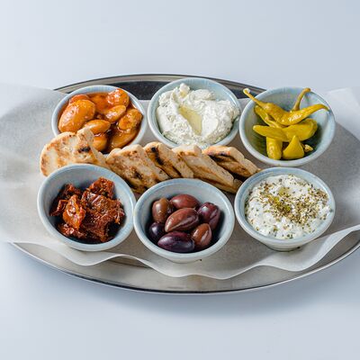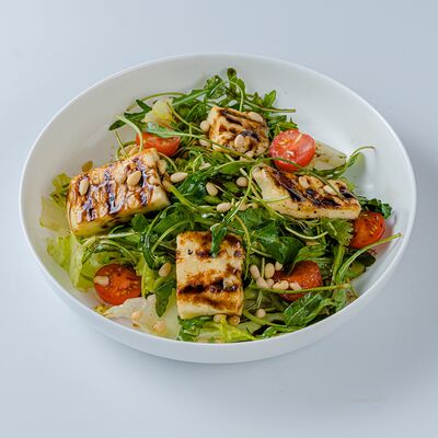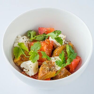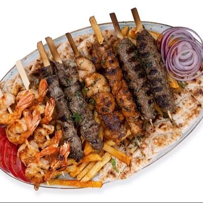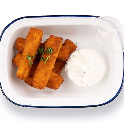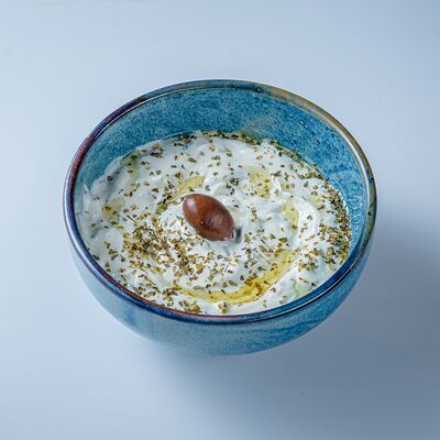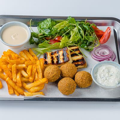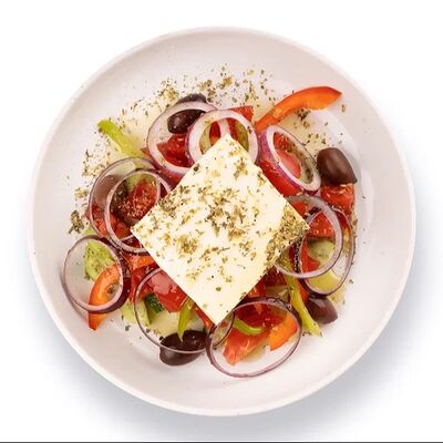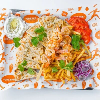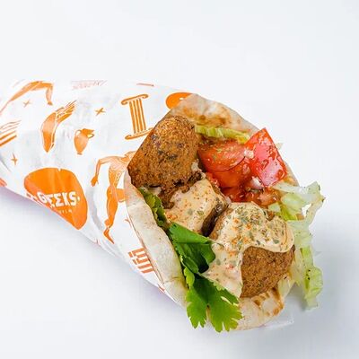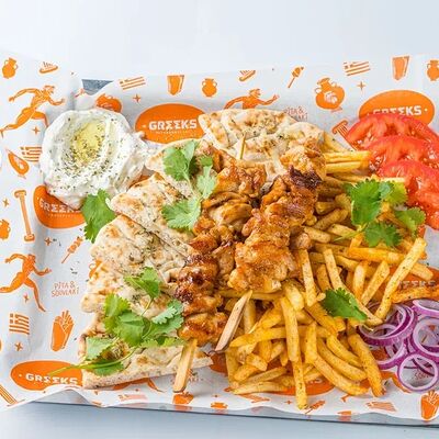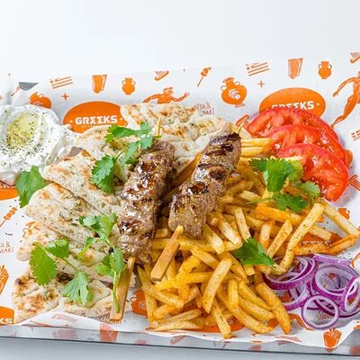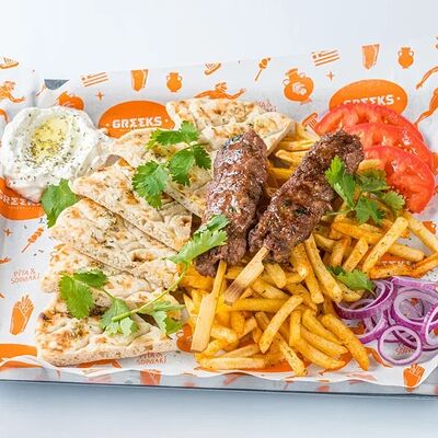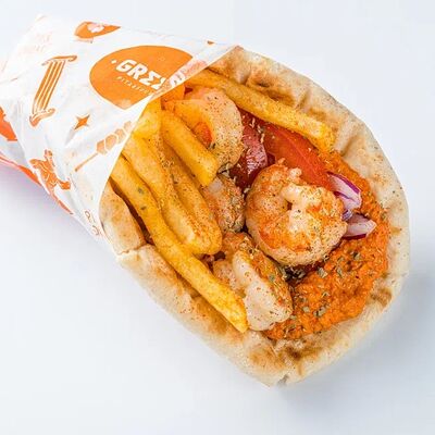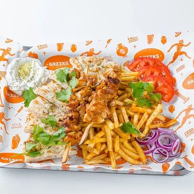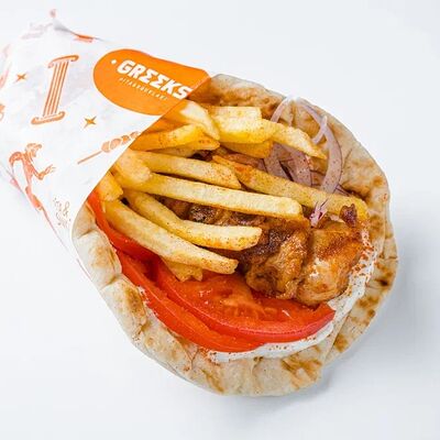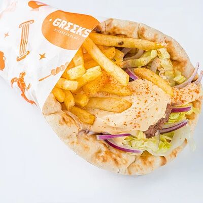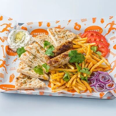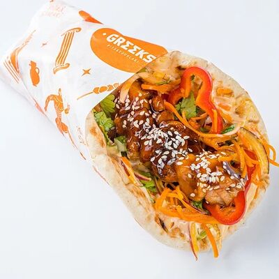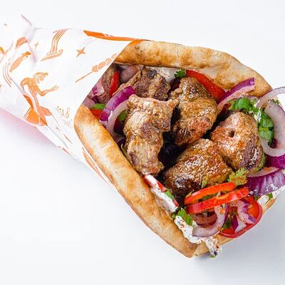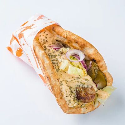 Пита, сувлаки из куриных колбасок, горчица, лук, соленый огурец, салат романо, сыр чеддер