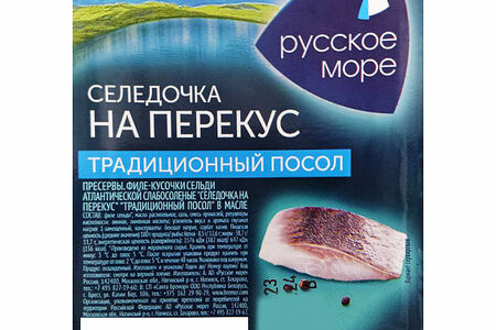 Пресервы. Филе-кусочки сельди атлантической слабосоленые «Селедочка на перекус» традиционный посол в масле, «Русское море». Атлантическая сельдь имеет жирное, нежное мясо, благодаря добавлению масла она становится еще мягче. Пряности и соль придают пикантный вкус пресервам, которые так и просятся на бутерброд. Удобный формат продукта в виде кусочков понравится тем, кто не хочет разделывать целую рыбу. Просто откройте вакуумную упаковку и наслаждаетесь качественным продуктом известного бренда.