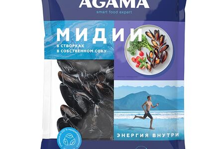 Мидии в створках Agama в собственном соку варёно-мороженые, 450г доставка