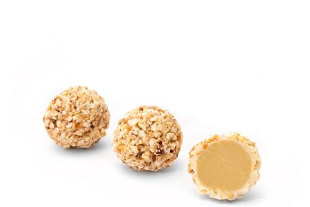 Белый шоколад (сахар, какао-масло, сухое цельное молоко, эмульгатор: соевый лецитин, натуральный ароматизатор: ваниль), сливки 35% (нормализованные сливки, стабилизаторы: фосфаты натрия, каррагинан), фундук дробленый, ореховая паста из фисташки, сироп глюкозы, коньяк КиН 5 звезд (дистилляты коньячные, выдержанные не менее пяти лет, вода питьевая умягченная, сахар, краситель-сахарный колер I простой). Содержит орехи, молоко, сою. Может содержать следы продуктов, вызывающих аллергию (3 шт.)