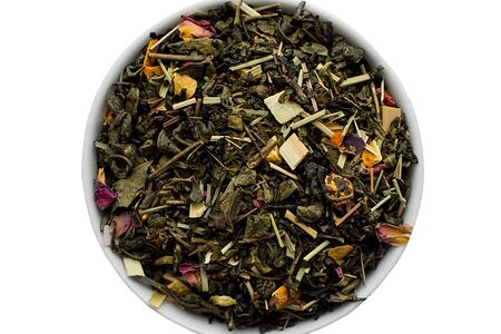 Зелёный чай, лемонграсс, цедра апельсина, ароматизатор, лепестки розы, кусочки клубники и маракуйи